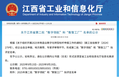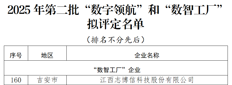 江西省工业和信息化厅公示 2025 年第二批制造业数字化转型标杆拟评定名单,志博信凭借在工厂智能化领域的突出实践,成功入选 “数智工厂” 拟评定名单,此次入选是省工信厅对公司落实《江西省制造业数字化转型行动计划 (2024-2025 年)》成效的权威认可,标志着公司数字化发展水平达到 L6 级以上标准。